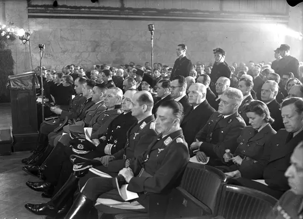 Begravelse til komponist Christian Sinding i Universistetets Aula i Oslo i desember 1941. Nazi-topper på rekke og rad. Politiminister Jonas Lie sitter på andre rad, nr. tre fra høyre.