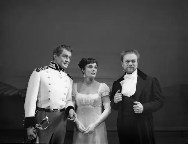 Teaterforestillingen "Krig og Fred" på Nationaltheatret med fra høyre Jørn Ording, Liv Strømsted og Lars Nordrum