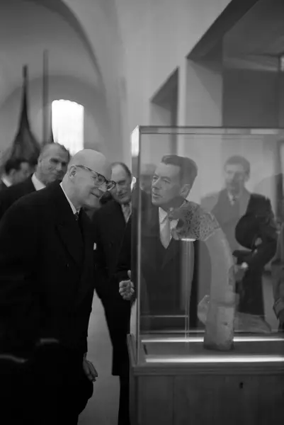 Finlands president Urho Kekkonen til venstre er på statsbesøk i Norge. Her blir han vist rundt på Vikingskipsmuseet av professor Bjørn Hougen.