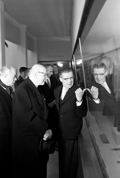 Finlands president Urho Kekkonen (nærmest) er på statsbesøk i Norge. Her blir han vist rundt på Vikingskipsmuseet av professor Bjørn Hougen.