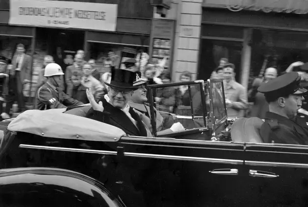 Finlands president Urho Kekkonen kommer på statsbesøk til Norge. Bilkortesjen med presidenten og Kong Olav i spissen på vei fra Østbanestasjonen til Slottet. President Kekkonen smiler og vinker til publikum.