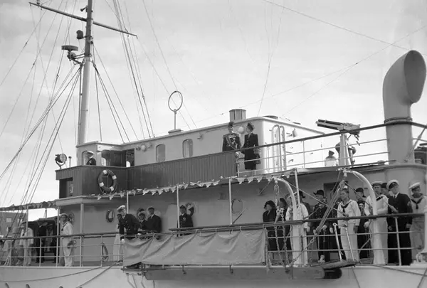 Kong Frederik og Dronning Ingrid på offisielt besøk i Norge. Her står det danske kongeparet på kommandobrua ombord på kongeskipet Danebrog.