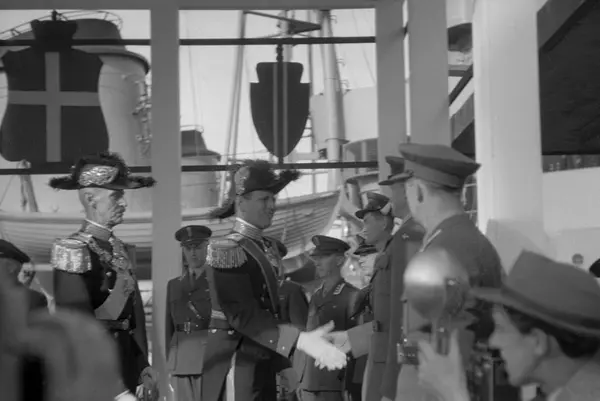Kong Frederik og Dronning Ingrid på offisielt besøk i Norge. Her hilser kong Frederik på offiserer fra forskjellige våpengrener. Kong Haakon og Kong Frederik bærer begge snutehatt.