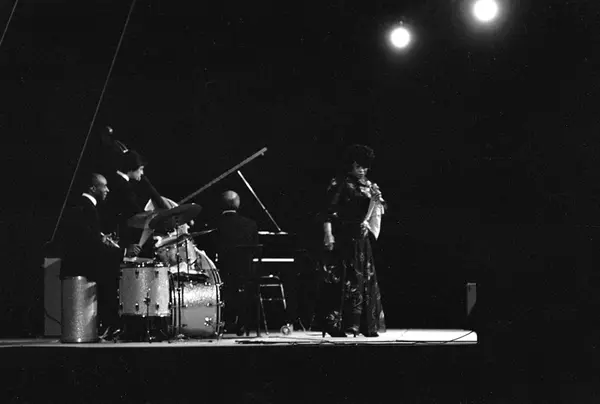 Konsert med Ella Fitzgerald og Flanagan's trio i Njårdhallen. Fra venstre Ed Thigpen på trommer, Frank de la Rosa på bass, Tommy Flanagan på flygel og Ella.