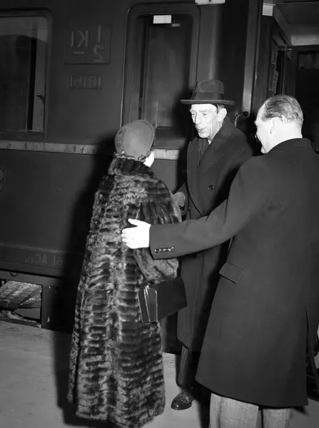 Foreningen Nordens kongelige gjest, prins Wilhelm av Sverige, blir mottatt på Østbanen av kronprins Olav til høyre og prinsesse Ragnhild.
