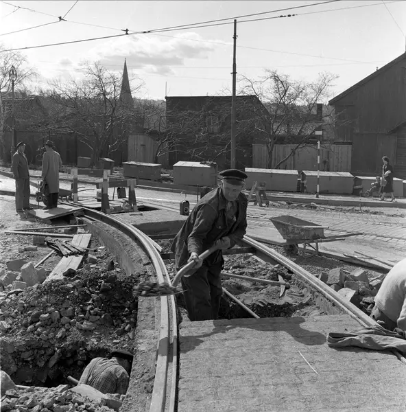 Sporveien har anleggsarbeider med trikkeskinner i Strømsveien på Etterstad i Oslo. Antatt i nærheten av Sotahjørnet.
