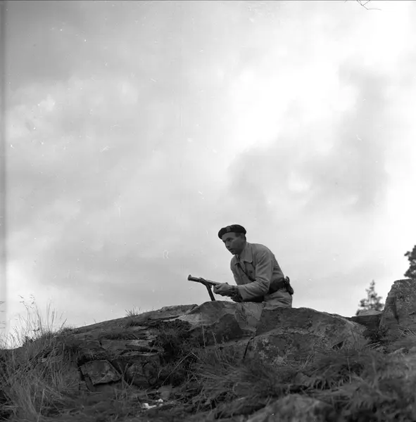 Politistudent med våpen. Oslo før 1954. Politiskolens trening i Gaustadskogen. Våpenet som politistudenten har skal være en Suomi M-37/39 maskinpistol. Kaliber 9mm parabellum.Våpenet er produsert av Husquarna i Sverige. Dette er en lisensproduksjon av den finske maskinpistolen med samme navn.