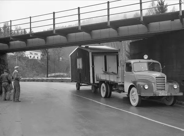 Drammensveien ved Reistad gård i Oslo. Trafikkbilde med transport av hytte på tilhenger, fotografert 29.10.1953.