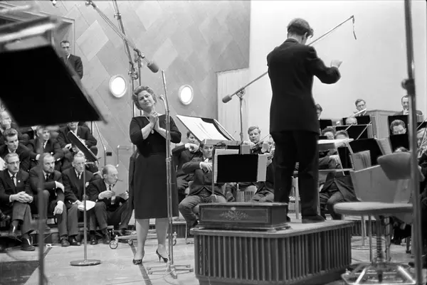 Kringkastingens "Vi går ombord", juleprogram, Oslo, desember 1962. Orkester og vokalist. Aase Nordmo Løvberg.