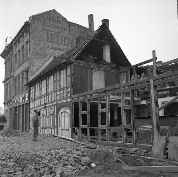 Schweigaards bru, Oslo, juli 1956. Anleggsarbeid. Bindingsverksbygning i Rødfyllgata 12 under riving, nå på Norsk Folkemuseum.