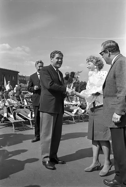 Skipsreder Jens Hagen t.v. og formann i Krigsinvalideforbundet Bernt Sveen, Oslo, 07.06.1963. Danskeferja "Holger Danske".