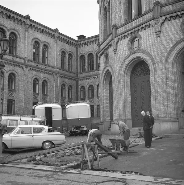 Karl Johans gate 22, Oslo, august 1963. Stortingets. Kings Bay-debatten. Arbeid på Løvebakken.