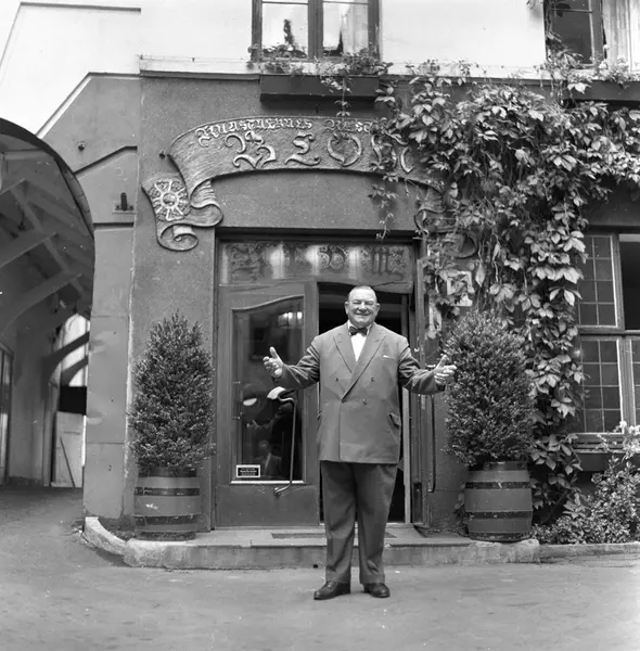 Karl Johans gate 41b, Oslo, 19.07.1962. Restaurant Blom. Direktør Steffens foran inngangen.