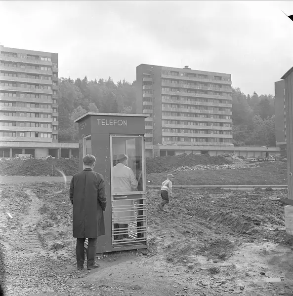 Mann i kø ved telefonkiosk mellom nye boligblokker ved Bogerud i Oslo. Uteoråder under arbeid.