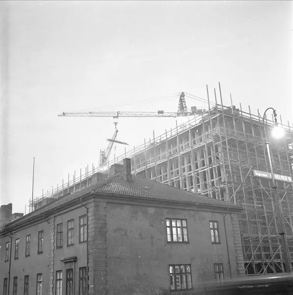 Fra Dagbladets negativarkiv (6 x 6) som Norsk Folkemuseum overtok 2003 Mottatt på dm, ingen under oppføring bak bygningen som huset Justisdepartementet 1883-1958, og som før det var Rikshospitalets hovedbygning. ---- kommentar slutt ---- Skrevet av: Øivind Østang