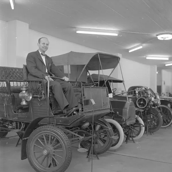 Fyrstikkalleén 1, Oslo, april 1962. Norsk Teknisk Museum. Mann og bilutstilling.