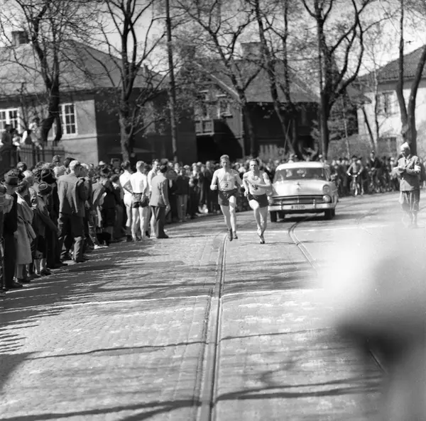 Deltagere i Holmenkollstafetten løper langs trikkeskinnen ved Hafrsfjords gate i Drammensveien. Antakelig BUL's Magne Åsbråten som veksler med hans O. Myhre. Gateløp fra Bislett til Besserud og tilbake. En amerikansk Ford 1955 i bakgrunnen.