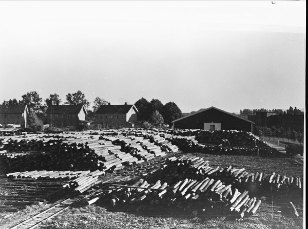 Nitedals Tændstikfabrik: Tømmertomten 1941. Arbeiderboligene i bakgrunnen er revet.