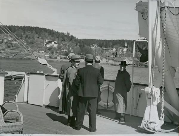 Menn på dekk på passasjer- og lastebåten M/S Black Prince, B/N 473 under prøvetur i Oslofjorden 27. april 1938. Skipet ble levert av Akers Mek. Verksted i 1938 til Fred. Olsen & Co, Oslo og gikk i rute Kristiansand - Newcastle.
