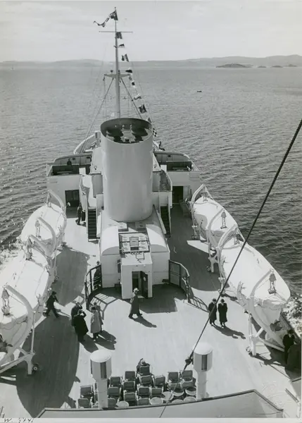 Menn på dekk på passasjer- og lastebåten M/S Black Prince, B/N 473 under prøvetur i Oslofjorden 27. april 1938. Skipet ble levert av Akers Mek. Verksted i 1938 til Fred. Olsen & Co, Oslo og gikk i rute Kristiansand - Newcastle.