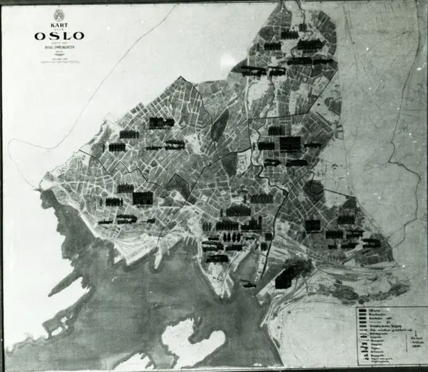 Brannvernutstillingen på Sagene brandstasjon 2.-9. januar 1936. Utstillingen var arrangert av Oslo Brannvesen i anledning Oslo Brandvæsens 75 års jubileum. Kart over Oslo 1930 med angivelse av brannberedskapen