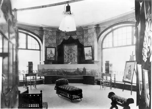 Severin Worm-Petersens atelier i Tordenskioldsgate 1. I atelieret hadde han to fremvisere for stereoskopi, og eksempler på egne bilder av Gamle Aker kirke, Nidarosdomen og Akershus Slott. Midt i rommet et panorama over utsikten fra atelieret mot Eidsvold plass med Nationaltheateret til venstre i bildet, Univesitetet og Grand og Storinget til høyre.