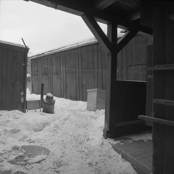 Arbeiderboliger for arbeidere ved Hjula Væveri i Sagveien 8: Priveter og boder for ved i gårdsrommet, 1977