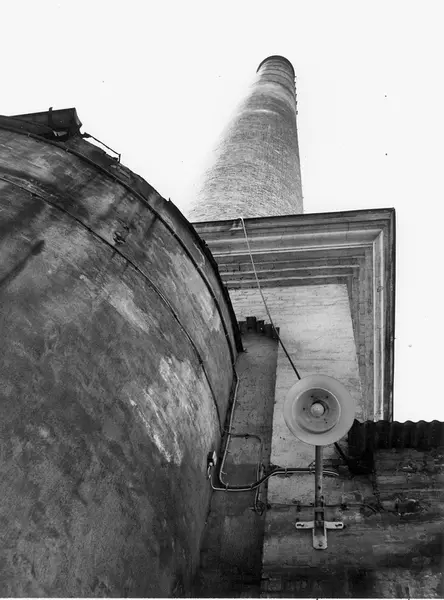 Detalj av kjelehus, Hjula Væveri. Tegningene til huset ble utarbeidet ved Myrens verksted i 1886. Fotografert i 1977