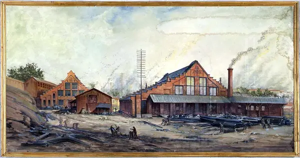 Vulkan Jernstøberi og mekaniske Verksted, Oslo på vestsiden av Akerselva ovenfor Grünerbrua (1873-1968). Foto av maleri av teatermaler Jens Wang til jubileumsutstillingen i 1914. Maleriet ble utstilt på Frogner. Nå i museets eie.