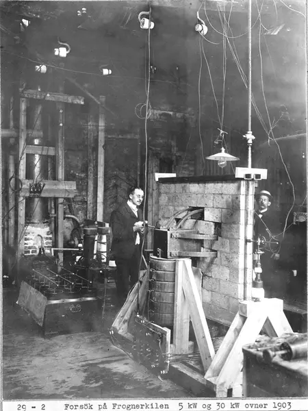 Norsk Hydros forsøksfabrikk for kunstgjødselproduksjon i Frognerkilen : 5 kW og 30 kW ovn. Fra forsøkene som ledet til Birkeland-Eyde-metoden ved Frognerkilen Fabrikk. Eivind Bødtker Næss (sannsynligvis) til venstre og Kristian Birkeland