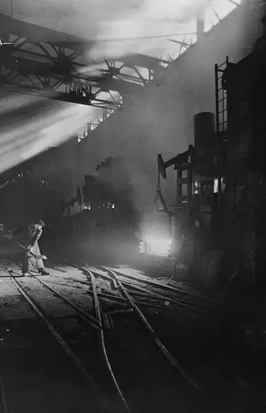 Arbeider raffinerer stålet i ovn I ved Stålverket til Christiania Spiger og Valseverk. Til venstre ovn II