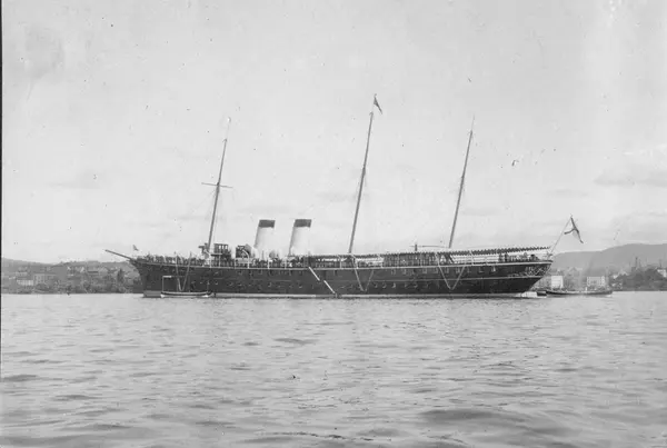 Dampskip med to skorsteiner, tre master, klyverbom og engelsk flagg i Kristianiafjorden utenfor Akers mekaniske værksted