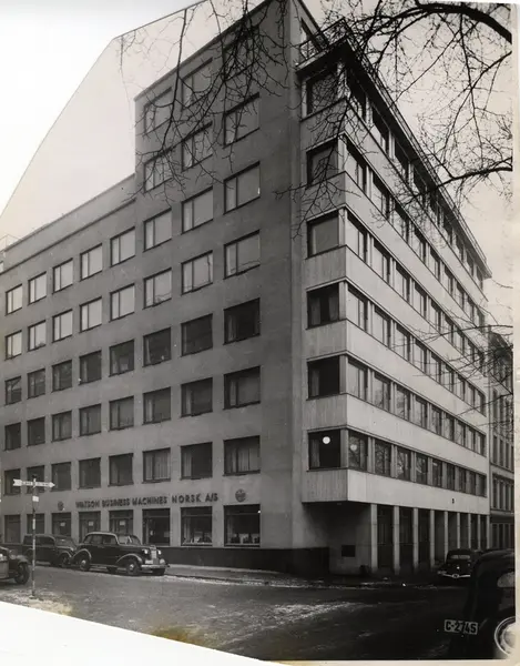 Watson Norsk AS, Rådhusgaten 23, Oslo, Norway. 1938-1955 Width - left front 28.04 m. Width - right front with entrance 25.2 m. Height - 25 m Outside construction - 15 cm reinforced concrete. gray mineralite Outside of entrance and lobby - yellow travertine (Italian) marble Watson offices - ground floor Area occupied - 337 sq. meters