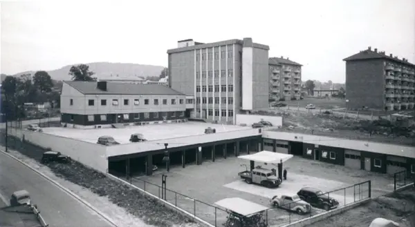Den nye automatiske telefonsentralen, Åsen sentral, hans Nielsens hauges gate, åpnet 1958, hadde ved starten kapasitet til 10 000 med nummerserien 21.00.00 - 21.99.99. Lys bil bak gjerdet, nærmest: Ford V8 1936 cabriolet. Opplysninger innsendt av Ivar E. Stav, juli 2015.