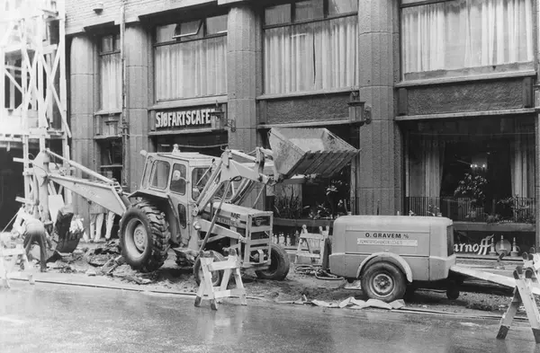 Byggeplass for Oslo teledistrikts nye telefonhus. Bil parkert foran Kongensgate 6, Sjøfartsbygningen
