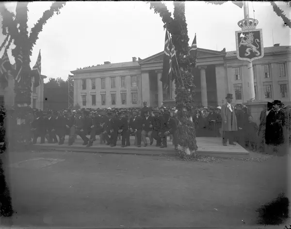 Polfarerne avventer barnetoget utenfor Universitetet på Karl Johan. Den norske løve og unionsflagget er heist.