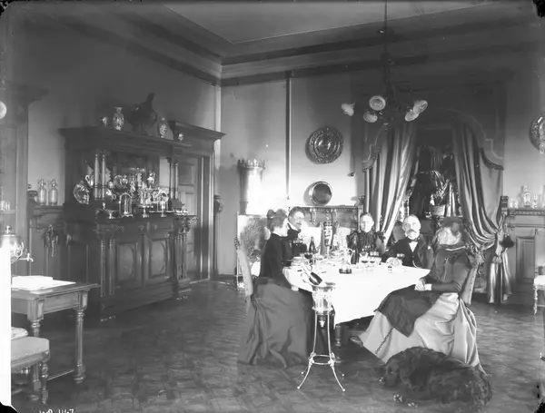 Sandakerveien, interiør spisesalen. Tre kvinner og to menn sitter rundt et bord. En hund ligger på gulvet.