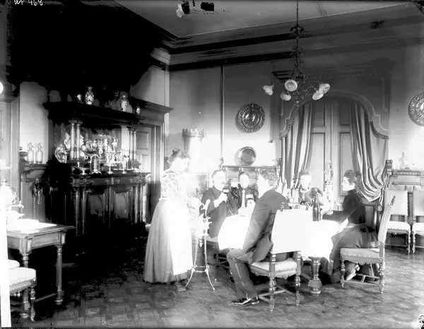 Sandakerveien, interiør spisesalen. Tre kvinner og to menn til bords, tjenestepike serverer vin.