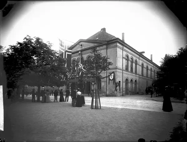 Kristiania Theater, siste spilleaften. Unionsflagget er heist.
