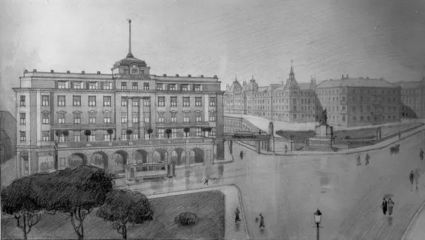Drammensveien, prospekt over arkitekt Dues plan. Urealisert bygning, Victoria Terrasse, Stortingsgata med trikk og Drammensveien (nå Henrik Ibsens gate)