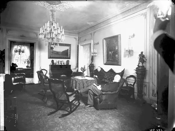 Skolebestyrer Lyches villa, stueinteriør med en eldre mann og kvinne. Til høyre ses fotografen som holder blitzen.