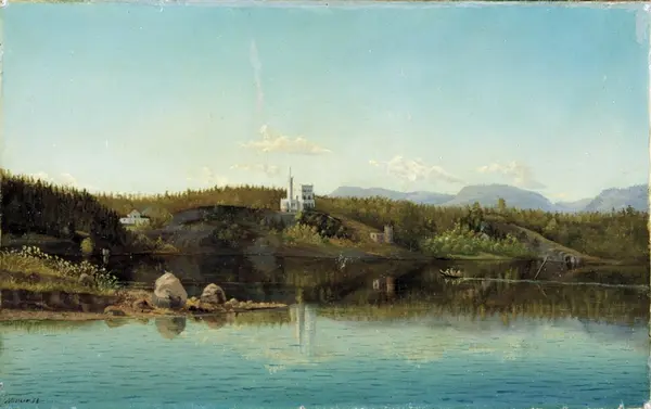 Beskrivelse: I forgrunnen vann med odde som stikker ut fra v. På vannet en liten båt m. 4 personer m. retning mot Oscarshall. En stake står på skrå i vannet. I bakgr. tv Dronninghavn i midten Oscarshall og th Henningslyst.