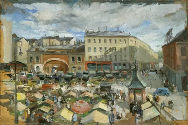 Beskrivelse: Youngstorvet med torvboder og parasoller i for- grunnen. Sett mot syd-øst med Bazarhallen i bakgrunnen. Pløens gate til høyre.
