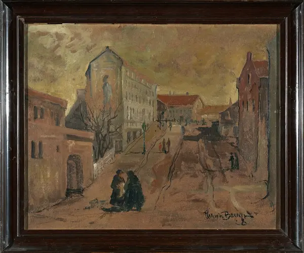 Beskrivelse: Gateparti m. bakke som går fra forgrunnen innover i bildet. I bakgrunnen for enden av bakken grått hus m. rødt tak. Tv langs fortau høy hvit bygning m. branngavl som er be- malt . Foran den et tre uten blad.