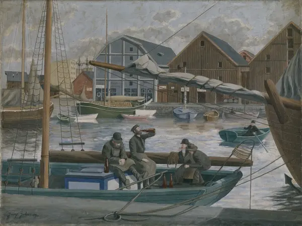 Beskrivelse: I forgrunnen sitter fire menn m. arbeidsforklær i en båt ved bryggen. Én drikker av en flaske. Th en mann som ror en liten båt. Ellers i havnebassenget flere små og større båter I bakgrunnen sjøboder med utsalg av effekter til sjøen.