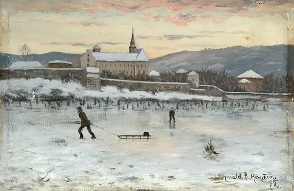 Beskrivelse: I forgrunnen den islagte fjord med en mann som drar en kjelke og en gutt på skøyter. Nedenfor Akershus er det antydet mange skøyteløpere. I bakgrunnen Akershus slott og fest -ning.