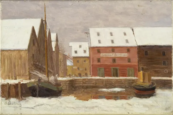 Beskrivelse: Havnebasseng med to båter den ene en seilskute. I mellomgrunnen tv gavlene fra fire sjøboder. I bakgrunnen fasa- der parallelt med kaien. På huset i midten står skrevet: Schram's Saltlager.