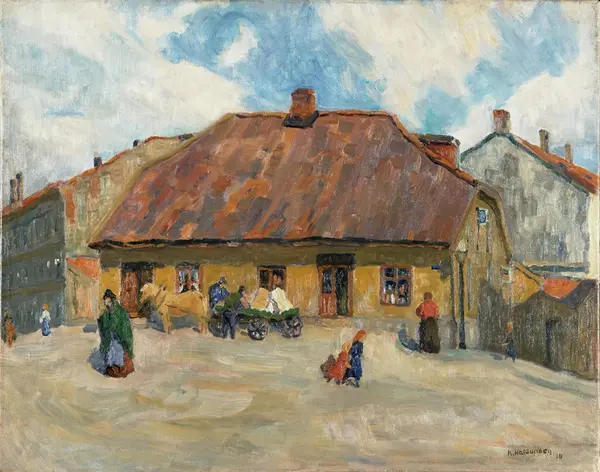 Beskrivelse: Midt i bildet en en-etasjes gul bygning m. rødt 1/2-valmtak. Foran huset en hestevogn med to menn ved siden. Tv nederst Maschmannsgate 4-6. Th Hammersborggate.