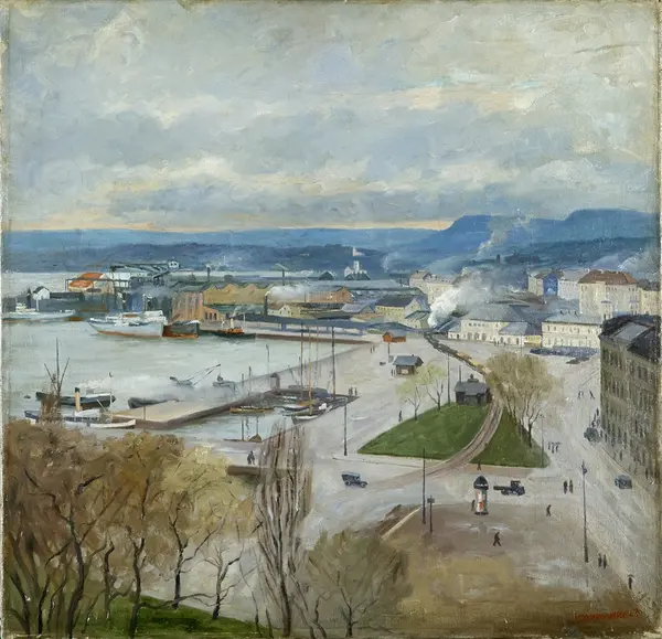 Beskrivelse: Pipervika med Sjøgaten th. I forgrunnen trærne nedenfor Skansen. Et tog er på vei over plassen. I havnebassenget en del seil- og dampbåter.