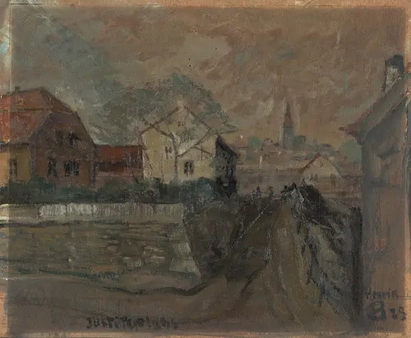 Beskrivelse: I forgrunnen tv tre hus på hjørne hevet over gaten med steinmur og stakitt. Th går gateløpet innover i bildet. I bakgrunnen kirke.